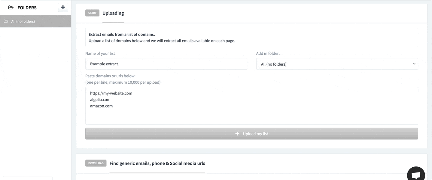 Obtenha e-mails, telefones e redes sociais em um clique.- Faça upload de uma lista de sites para extrair e-mails