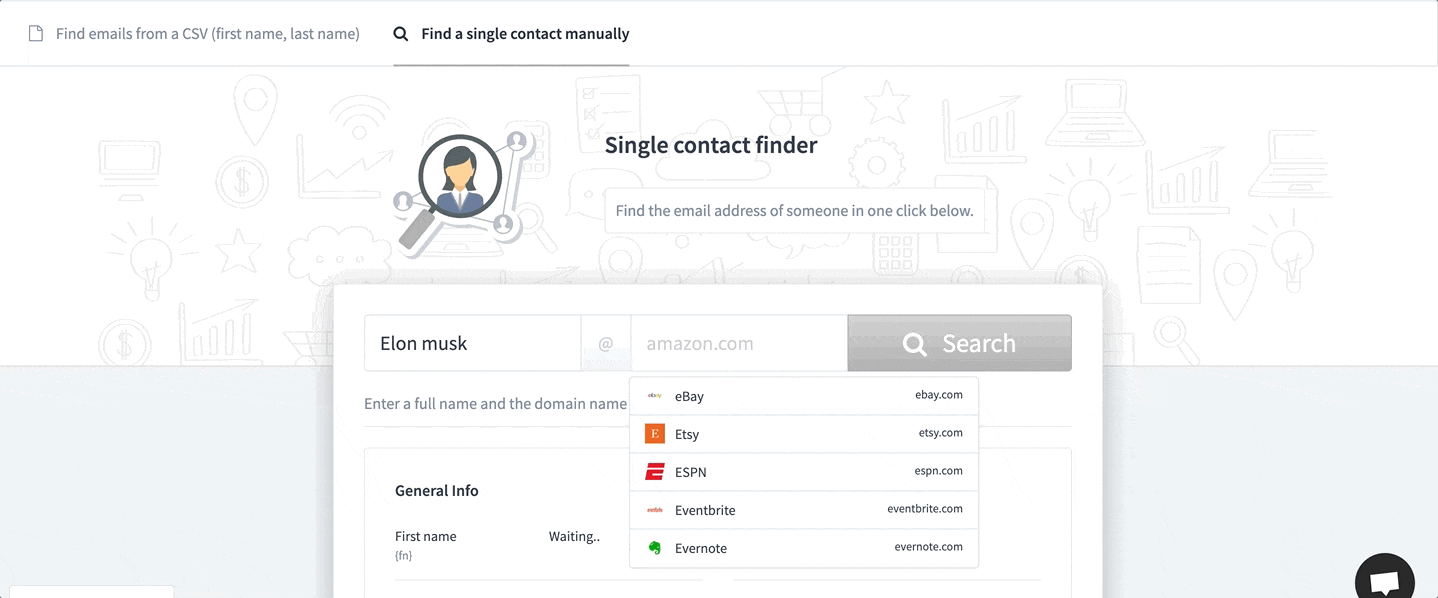 Você poderá fazer upload de um CSV com estas informações: primeiro nome, sobrenome e nome da empresa (ou domínio). Uma vez que você faça o upload dos dados, a ferramenta tentará encontrar o e-mail de cada contato a partir do formato do e-mail (por exemplo, primeiro.sobrenome@empresa.com). Esta ferramenta é perfeita para descobrir e-mails de uma lista de dados de negócios.