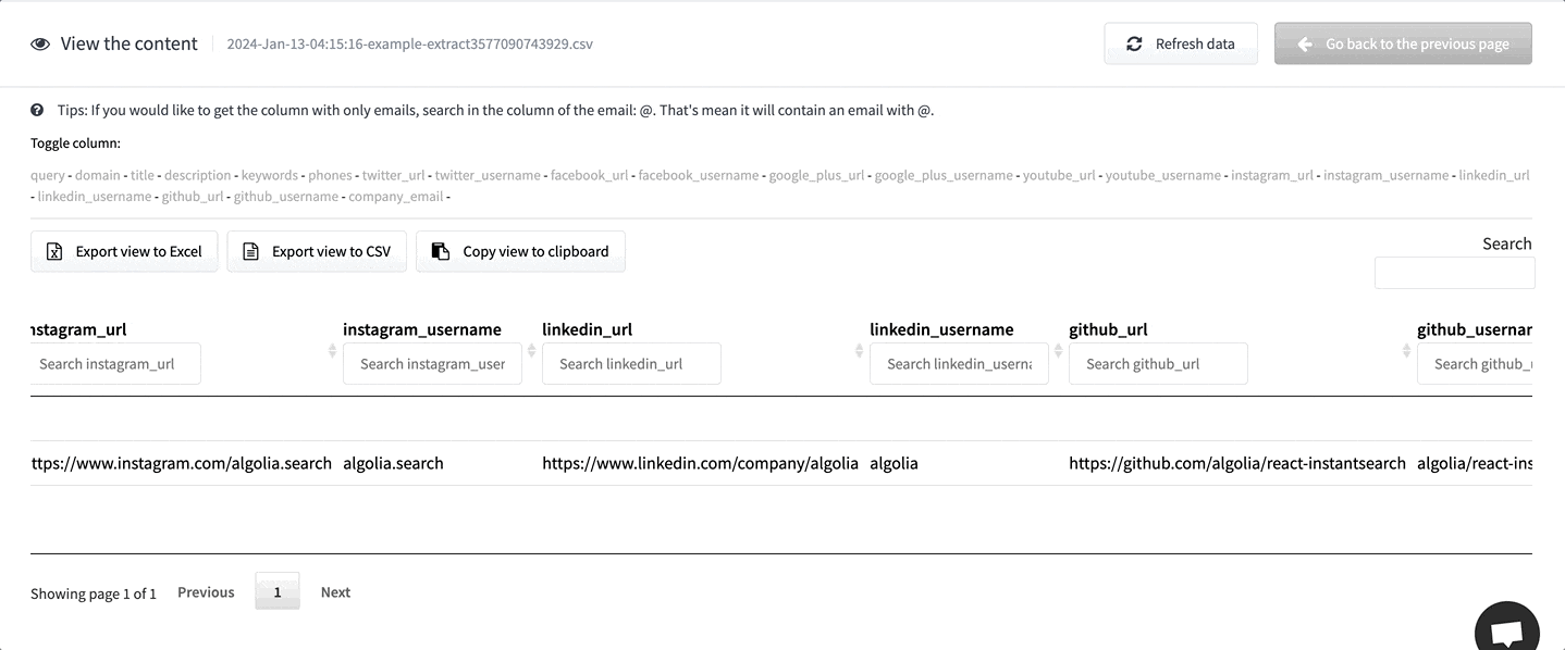 Você pode fazer upload de uma lista de domínios e extrair e-mails, URLs de mídias sociais e nomes de usuário (Facebook, Twitter, etc.), números de telefone em todas as páginas de cada website. Um relatório está disponível para download em Excel assim que todos os e-mails forem extraídos. Esta é a melhor solução para extrair todos os e-mails de uma lista de websites (empresas).